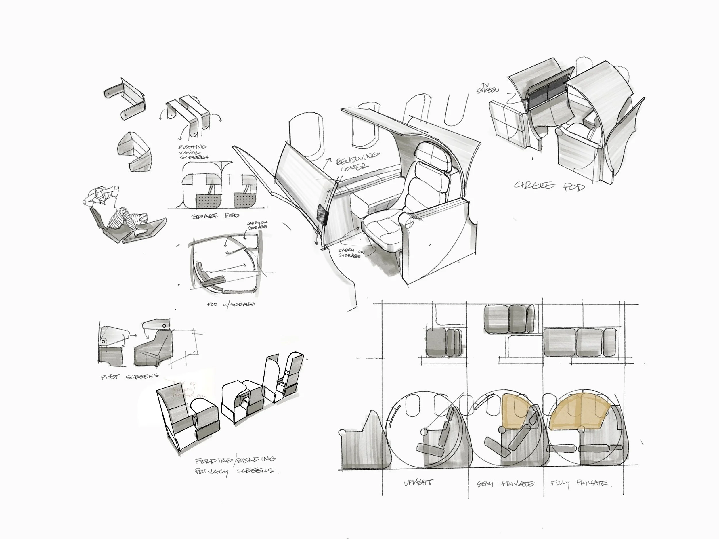 The research phase helped to refine my direction and establish a vision of what I wanted to achieve in a design. I determined that a sense of enclosure and privacy play a large role in a passengers feeling of comfort and safety. Within that direction I began to explore a variety of forms that would meet the sponsors requirements as well as to be a leap forward in value for the passenger and airline.