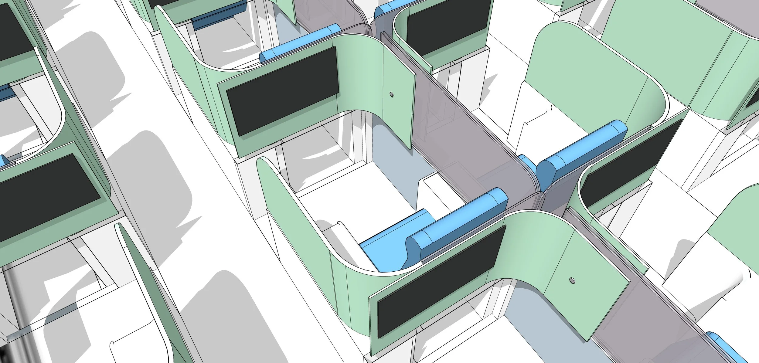 After exploring a variety of form options that fit the project constraints, I discovered that a cylindrical pod would fit the required number of seats as well as allow a passenger to fully extend to a flat sleeping position. This shape makes it possible to rotate around a central axis that allows the passenger to enclose overhead panels as well as a hidden slotted door to enclose their space.